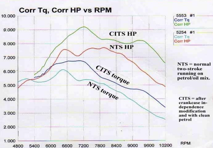 Before the V-twin prototype which you see above, a single cylinder Yamaha 100 cc was tested as supplied, and then modified with the CITS isolation of the crankcase void from the induction. It was then tested by the same supplier on the same dynamometer. See the chart below off the actual dynamometer, showing the before-and-after dramatic improvement. The V-twin’s pivot inlet-valve and By-pass valve throttle advantages add to this remarkable efficiency improvement, on V-cylinder formats, when these valves fit between cylinder pairs.( NTS = Normal Two-Stroke in the chart below).